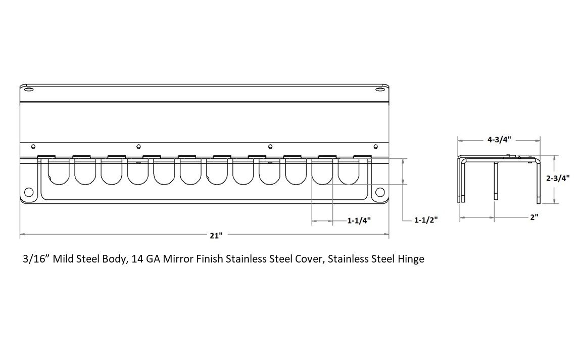 Load binder hanger 21 inch with stainless steel cover, has 12 slots for storing load binders or chains, with up to 1/2″ hooks. The stainless steel cover has a mirror finish and is attached to the gloss black powder coated steel body with a stainless steel hinge. Comes with (4) 1/2″ mounting holes.