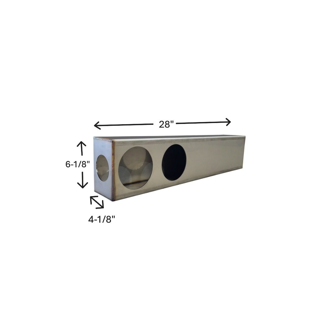 Stainless steel double tail light box with side marker, 28″ mounts two 4″ and one 2 1/2″ rubber mounted sealed lamps. Used for both left hand and right hand applications.