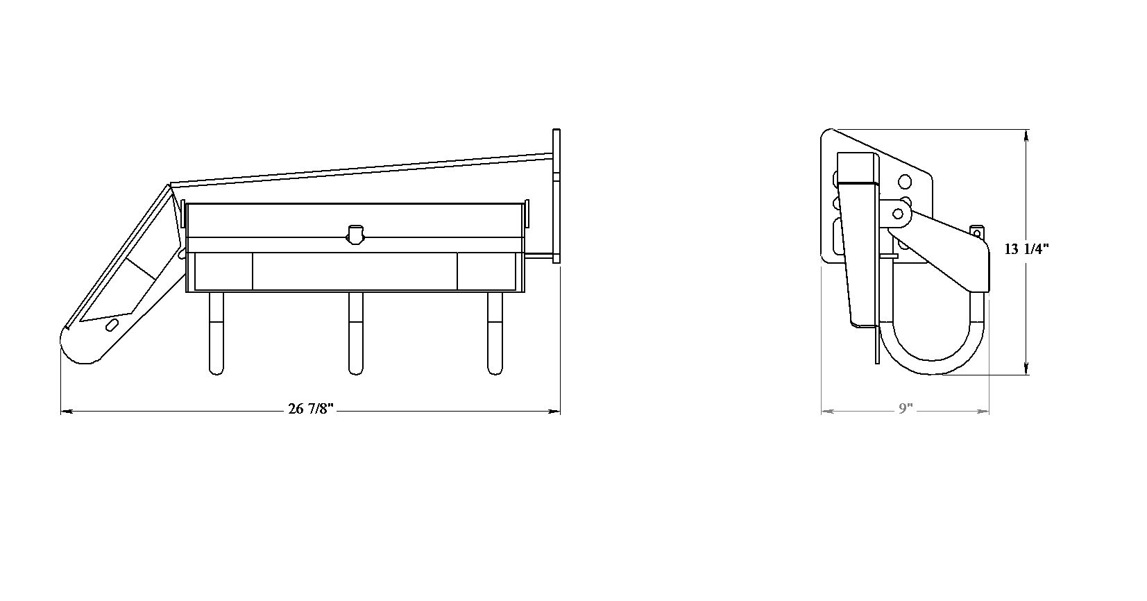 Tire chain hanger / mud flap bracket universal fit, LH is an ideal solution where there is limited space on your truck frame. The universal fit base has a variety of mounting hole configurations to fit a broad range of trucks. A smooth aluminum cover with conspicuity tape can be pinned down to secure your tire chains. Comes with a mud flap retainer bracket. The steel body of this chain hanger / mud flap bracket is powder coated gloss black for a shiny durable finish. Designed for mounting behind the rear axle, left hand.