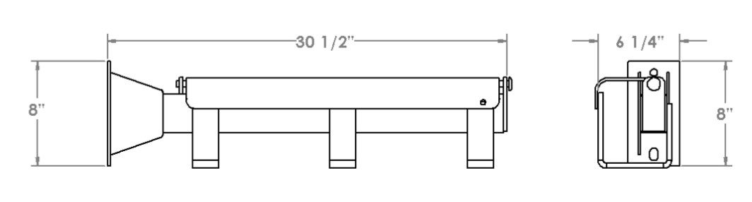 Tire chain hanger with 4″ mounting base, LH has 2 mounting holes and smooth aluminum cover. Hooks are formed 3/8″ steel. Powder coated gloss black.