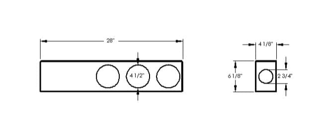 Triple tail light box with side marker, 28″, mounts three 4″ and one 2 1/2″ rubber mounted sealed lamps. Manufactured with 12 Gauge steel. Used for both left hand and right hand applications.
